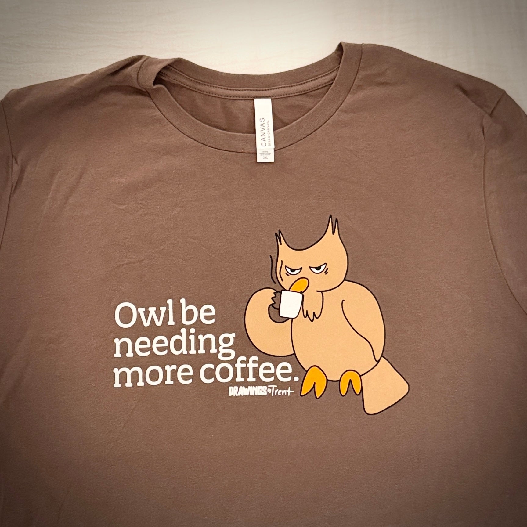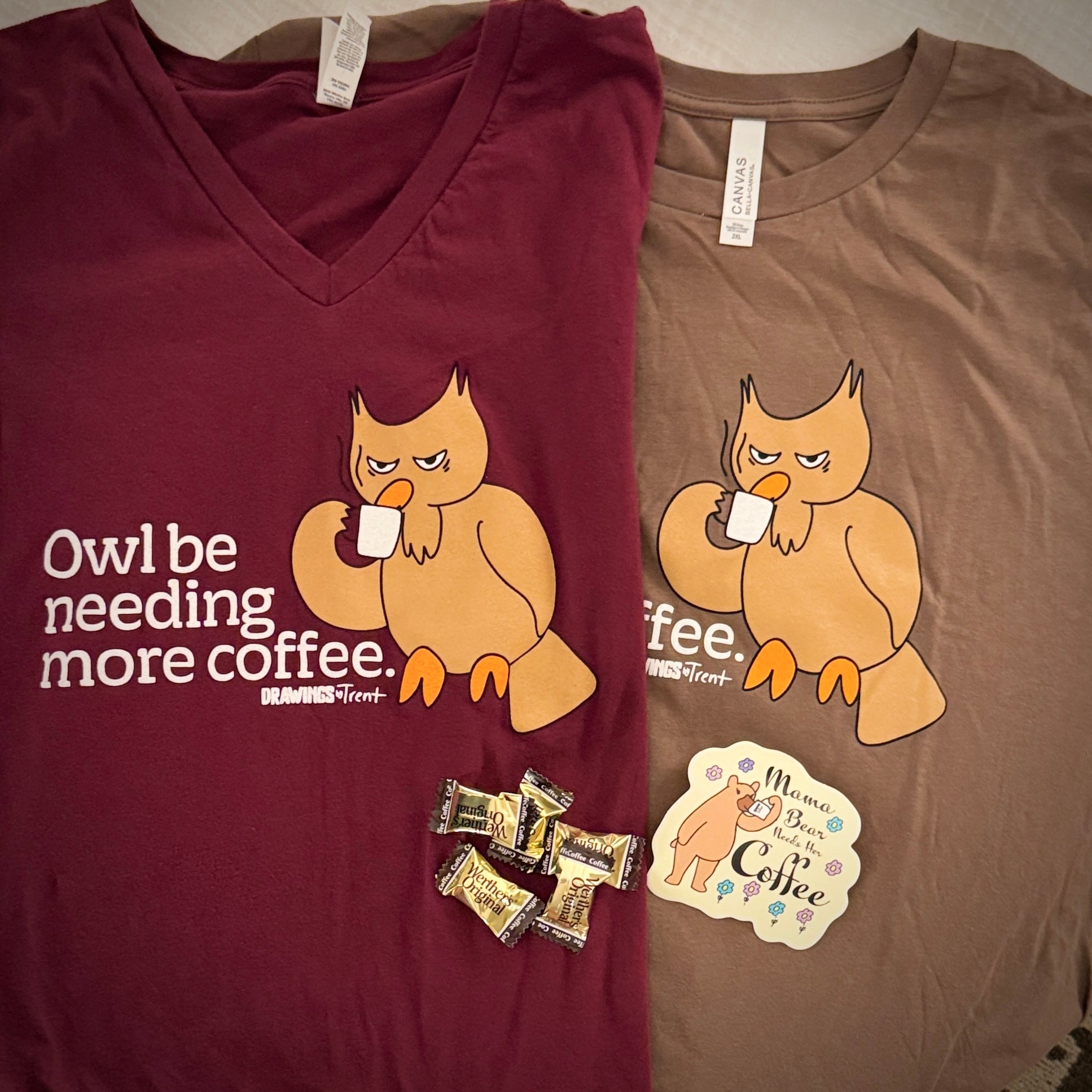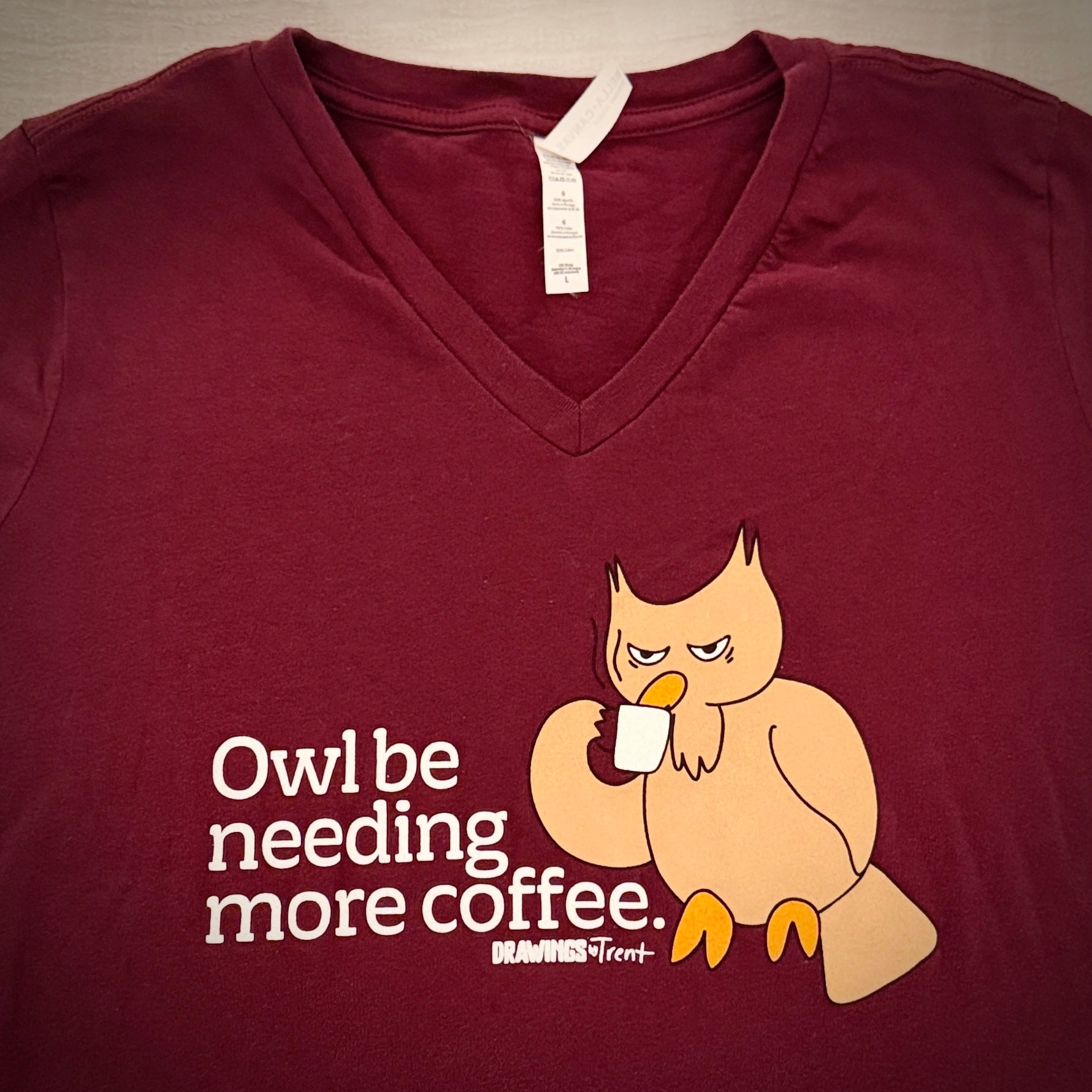 Your choice of a maroon women’s v-neck or cocoa crewneck tee featuring Trent’s “Owl Be Needing Coffee” design